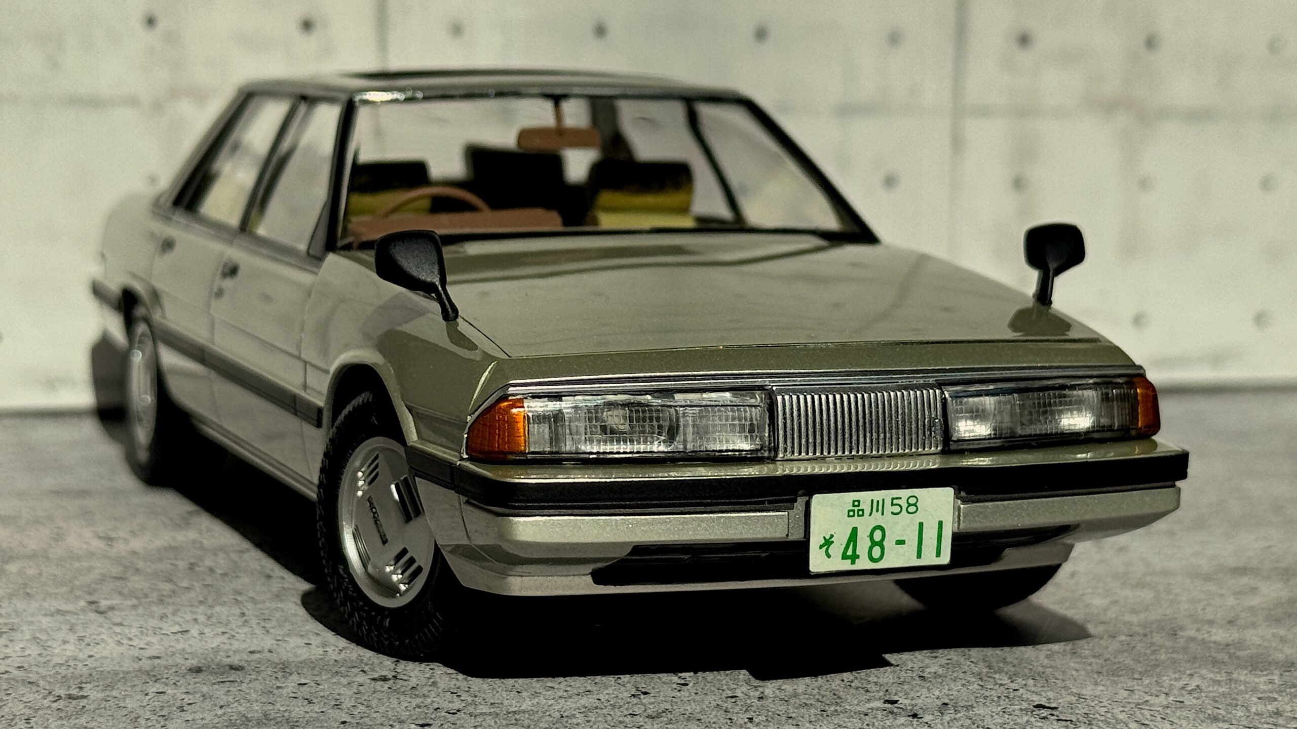 丁寧に吹き重ねたクリアを研ぎ出し、時間をかけて鏡面に磨き上げることで、昭和の高級車らしい深い艶を再現。