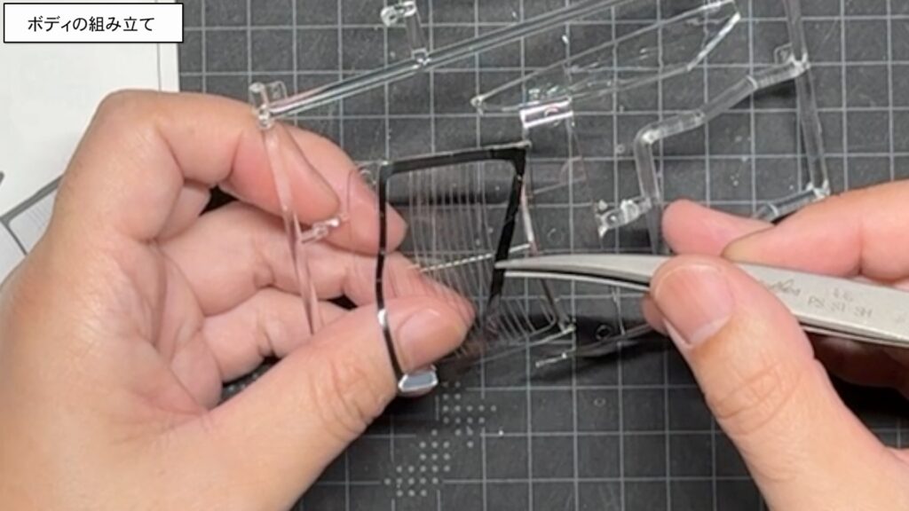 無理にはめ込もうとするとウインドウパーツが割れてしまうことがあるので、スムーズにはまる位置を探りながら慎重に取り付けます。