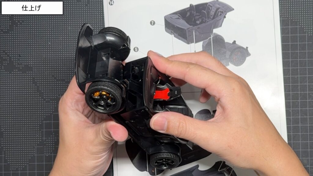 サイドスカートは、はめ込み部分が少し弱めなので、正面から見たときにフェンダーと一直線になるよう角度を確認しながら組み付けていきました。