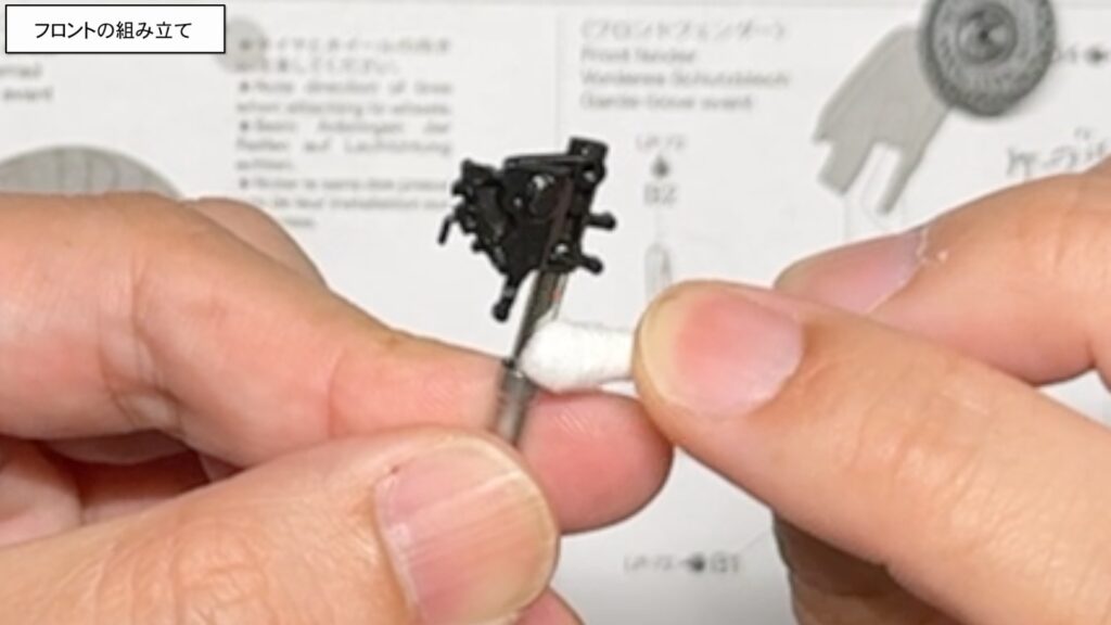 フェンダー側にはピンバイスで穴をあけ、マイナスモールドを使ってしっかりと取り付け。