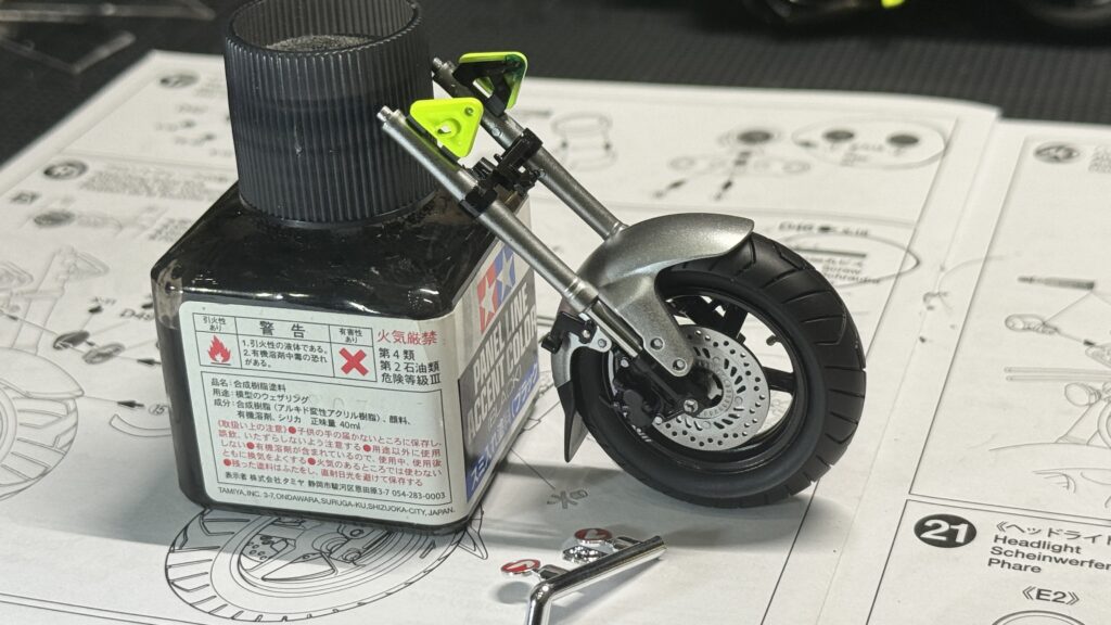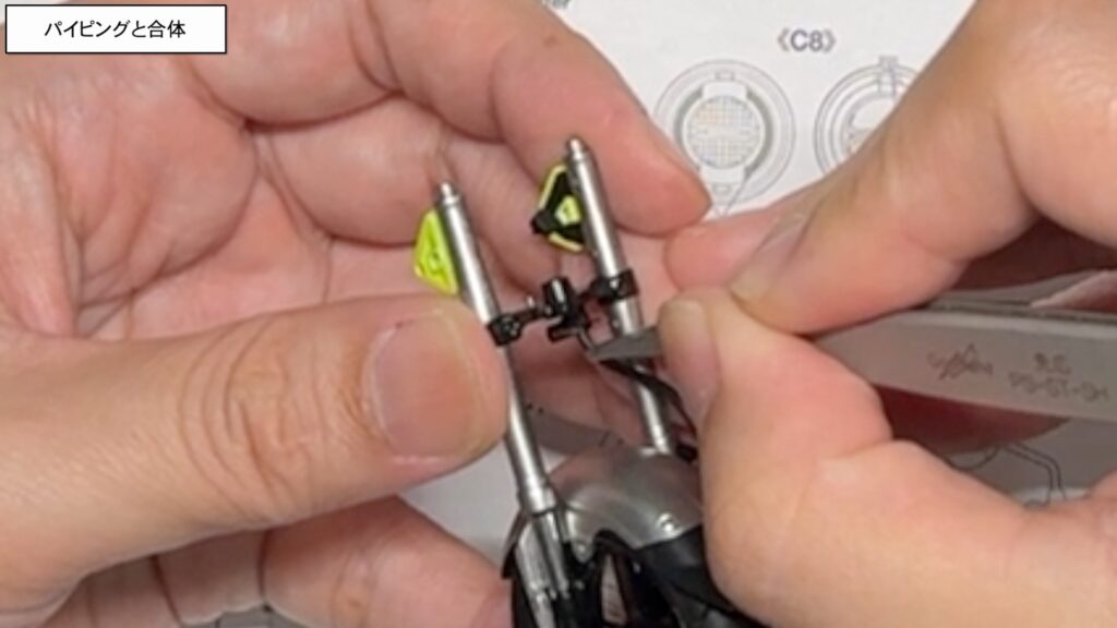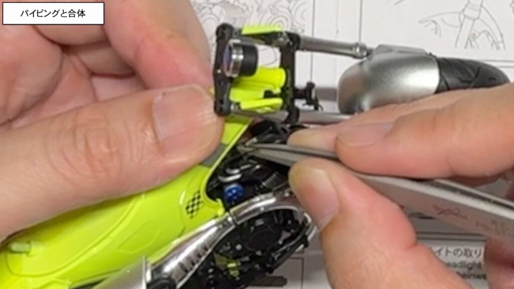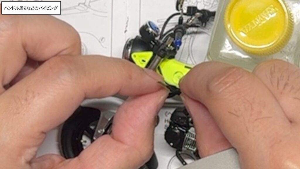 最後に、ハンドルへと繋がるパイプをまとめ、ヘッドライト裏を通しておき、この後の接着作業に備えます。