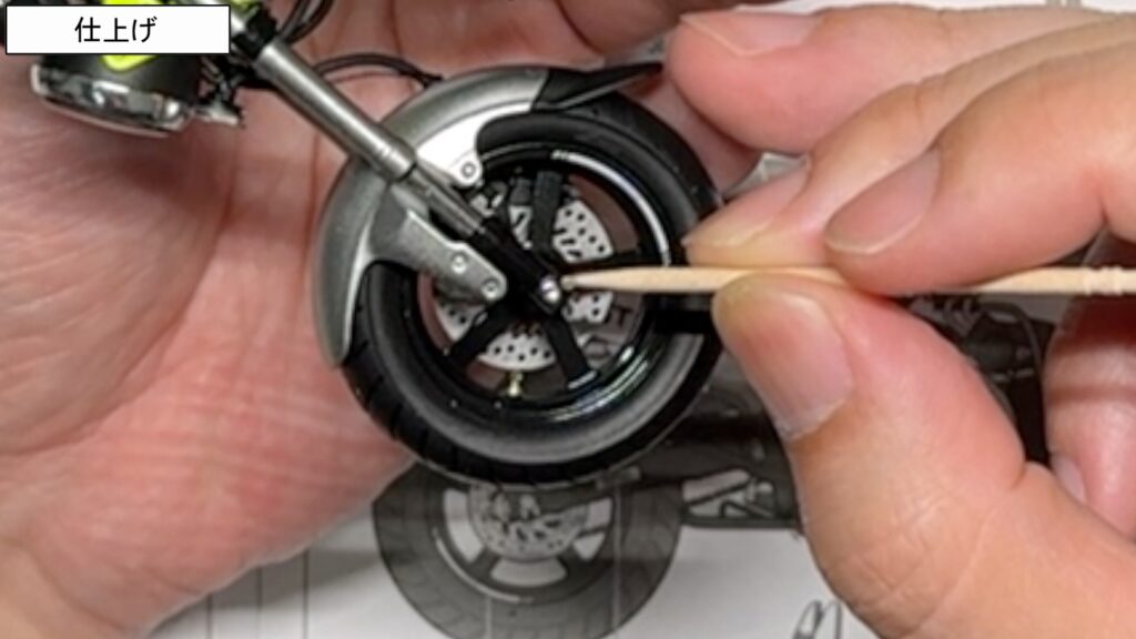 塗装仕上げで丁寧に塗り分けておいたフロントフォークですが、さらに仕上げとしてインナーチューブにはハセガワのミラーフィニッシュを細くカットして貼り付けていきます。
