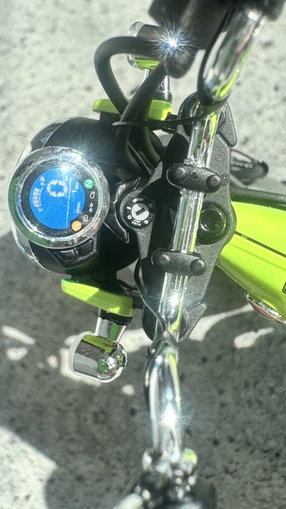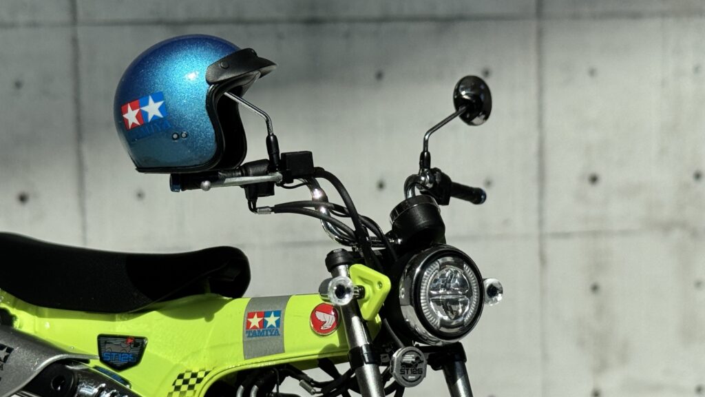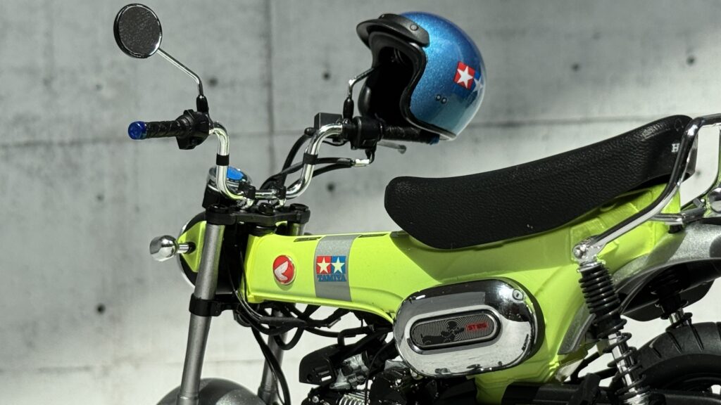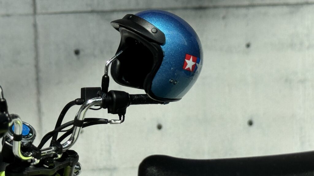 ハンドルのグリップカバーは、付属のヘルメットに合わせてメタリックブルーで仕上げました。
