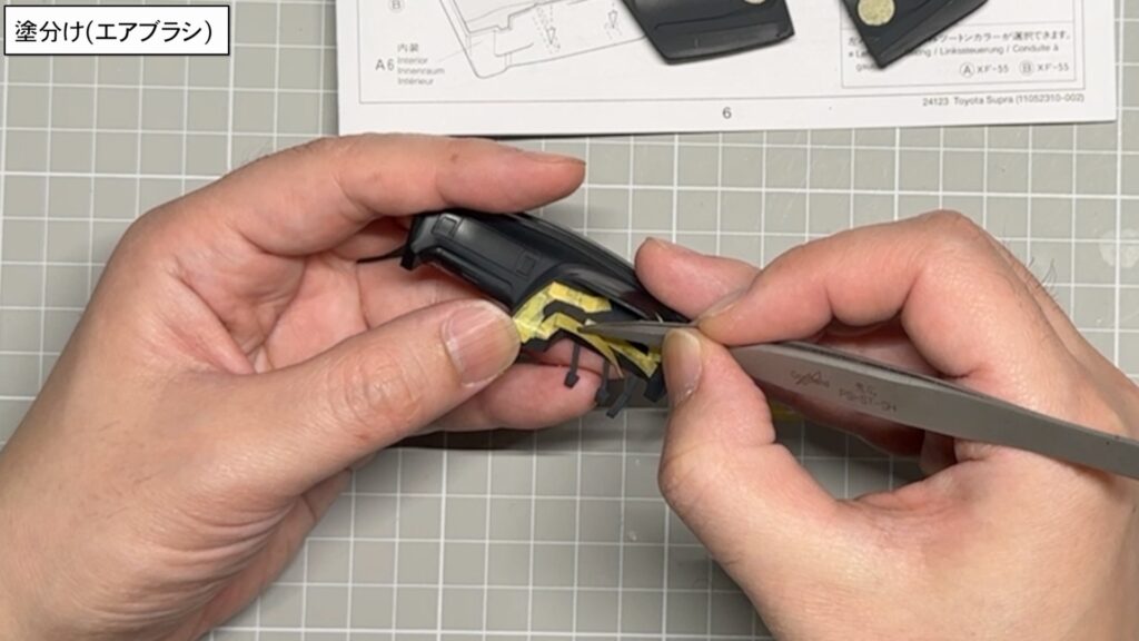 インテリアはマスキングの手順を逆算し、まずは質感を重視してラバーブラックを全面に塗装。