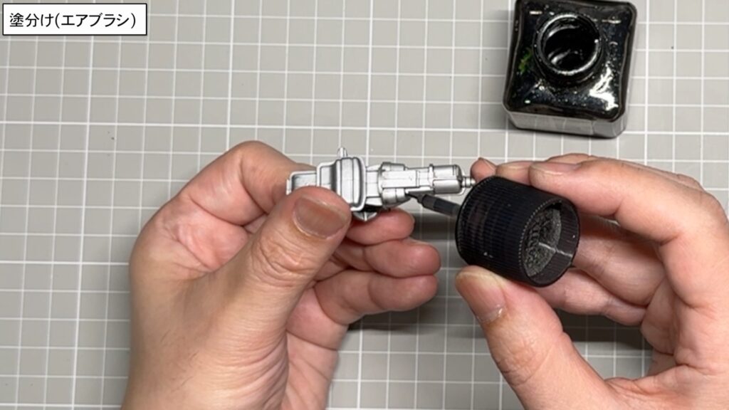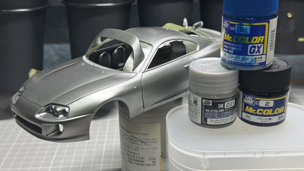 調色はクレオスのスーパーファインシルバーをベースに、ブラックで彩度を落とし、隠し味にブルーを1滴投入して鮮やかみを出しました。