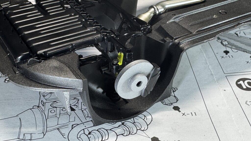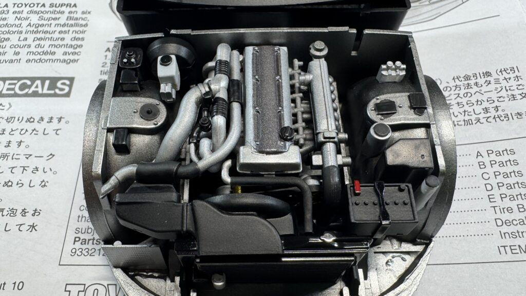 エンジンや足回りのデカールは今後の作業もありますので完成間際にはりつけるとし、くみあがったエンジンルームにはサーモススタット部にシュナイダーのクロームマーカー、バッテリー部にレッドを差し込んでおきます