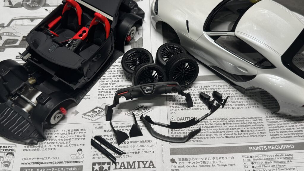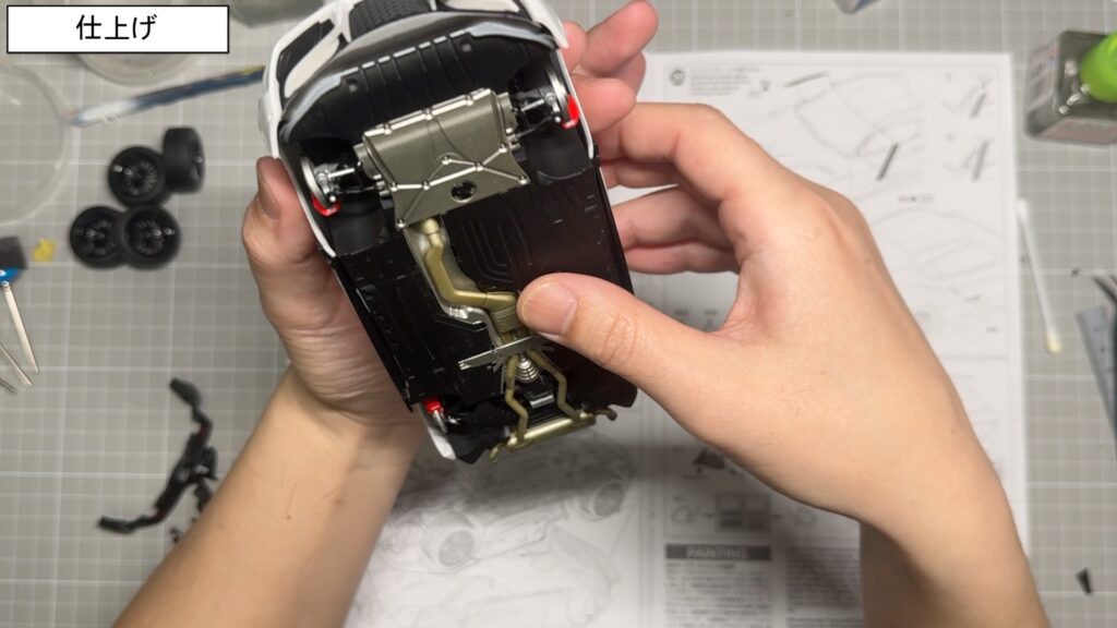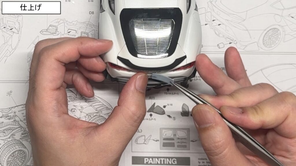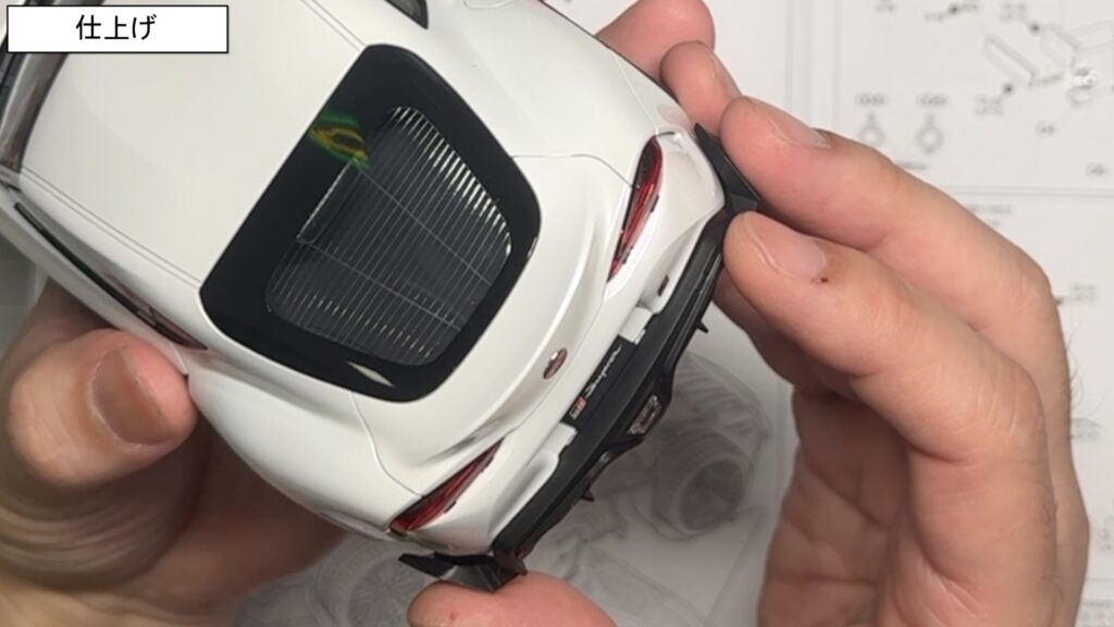 外装のバンパー周りも、エンブレム部分やダミーのインテークパーツを一つずつ取り付けていき、