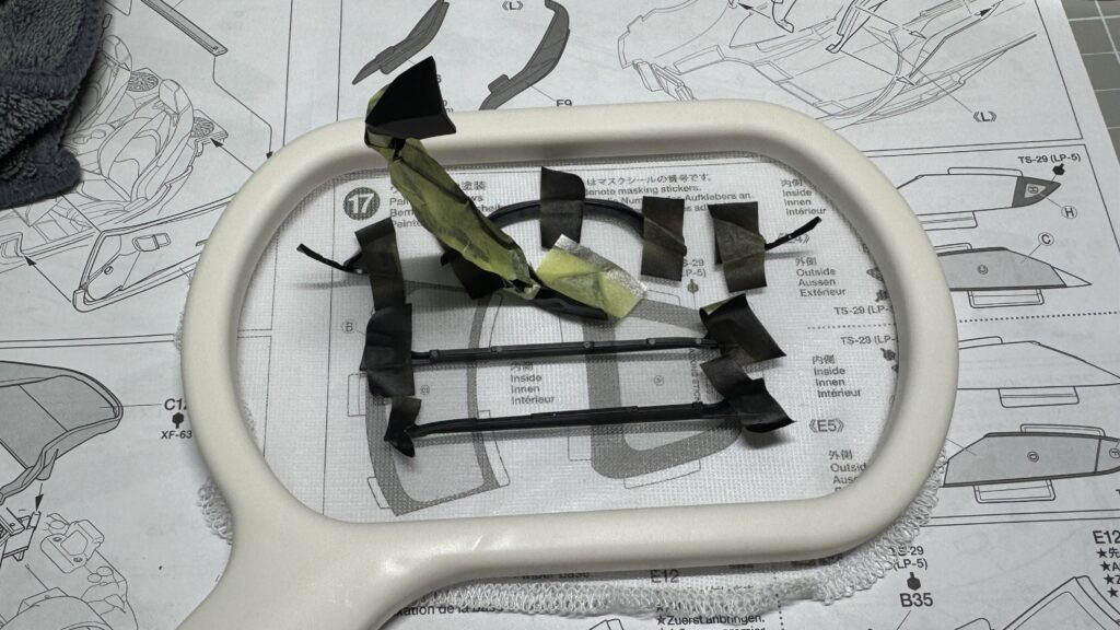 まずはパーツの塗装したい面に、ネットをマステでしっかりと貼り付けて固定します。